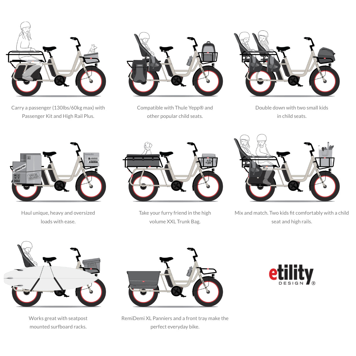 Extended cargo capability so you can take on even bigger everyday adventures. Bring two passengers along for the ride with child seats or Benno passenger accessories.
